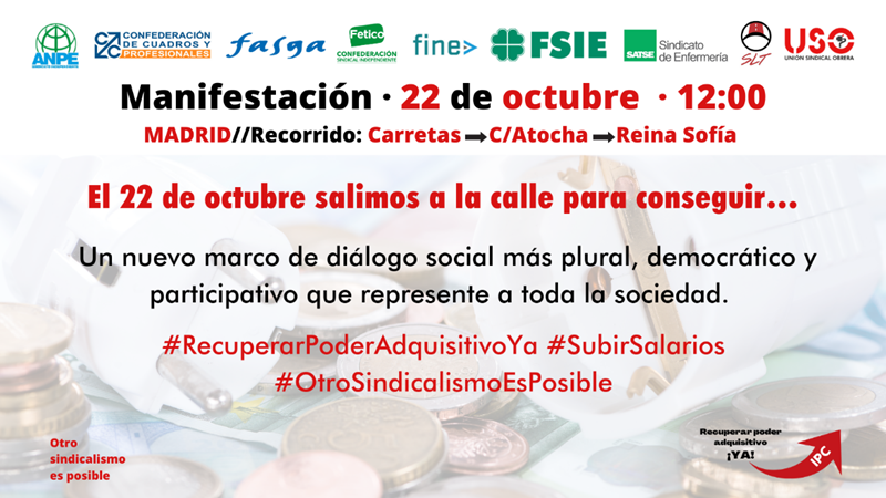 El próximo sábado, 22 de octubre, CCP - Confederación a la que pertenece ATYPE - volverá a salir a la calle, en esta ocasión para participar en una gran manifestación convocada por esta organización y 8 sindicatos más (ANPE, FASGA, FETICO, FINE, FSIE, SATSE, SLT y USO) para reclamar por un nuevo marco de diálogo social más plural, democrático y participativo que represente a toda la sociedad.